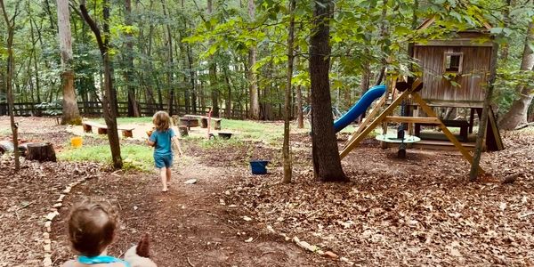 Located on our wooded home property, with a 2+ acres just for the Forest School, the space backs into an extensive forest and trail system that includes gently flowing streams and a lake.